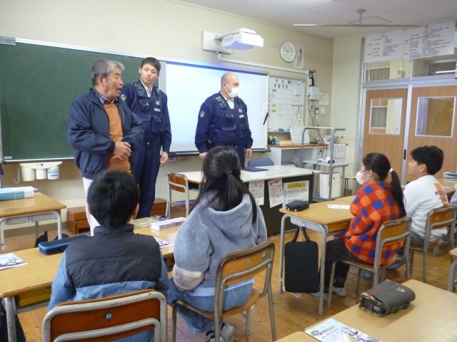 河辺交番の2名の方に来ていただいて、3年生の社会科の授業を行いました。まず、警察...