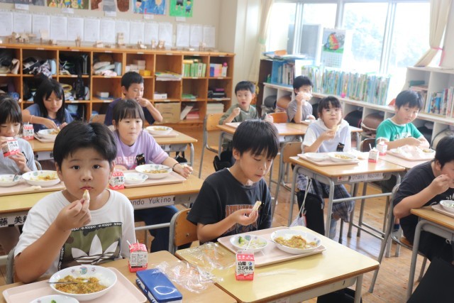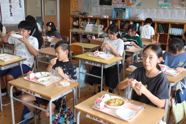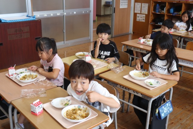 今日の給食のキーマカレーは、ご飯のほかにナンがついていました。ナンにカレーをつけてニッコリ。学校中に笑顔が広がりました。楽しい笑顔で満腹になりました。