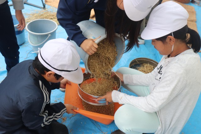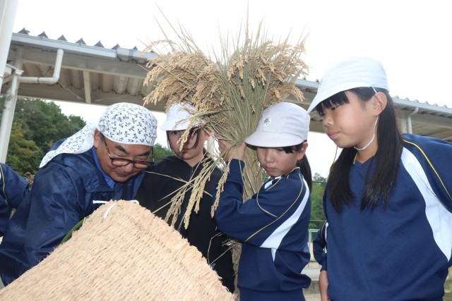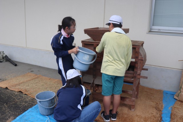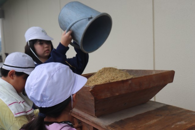5年生が脱穀作業をしました。先日、稲刈りをした稲を2週間ほど干しておき、今日は、いよいよ脱穀です。昔の米作りを体験しようということで、これまでに手植えによる田植え、鎌を使っての稲刈りをしました。そして、今日は「足踏脱穀機」による脱穀と「唐箕」による風選(ふうせん)を体験しました。「足踏脱穀機」は、円筒型の胴に逆V字型の針金を付けたもので、踏み板を踏むとその胴が回転するという機械です。稲穂を一束持ち、穂先を胴に当てて、回しながら脱穀します。大正時代から昭和30年代ごろまで使われた道具です。「唐箕」は、脱穀した籾から、稲の葉や藁くずを取り除き、籾を選別するための機械です。手動の回転式レバーを回すことで人工的に風を起こし、風の力で籾や藁くずなどをそれぞれの重さに選別するという装置です。明治時代から使われ始め、一般の農家に広く普及したのは大正時代と言われています。