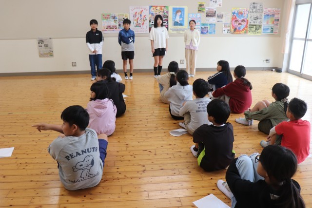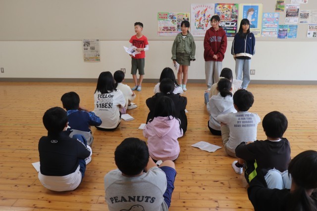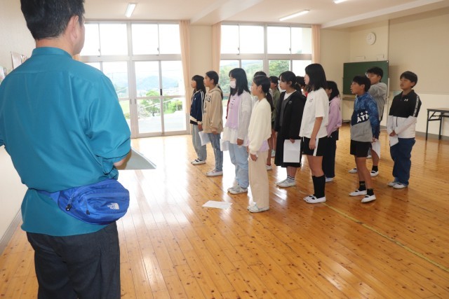 明日、明後日の2日間、5年生は渋川青年の家に「海事研修」に行きます。今日は、出発式でした。まずは、「海事研修の歌」を元気よく歌い、式がスタートしました。続いて、一人ひとり目標を言っていきました。みんなで協力すること、決まりを守ること、人の話を聞くことなどを堂々と伝える姿が立派でした。海事研修を終えて、ますます成長してくれることを期待しています。また、代表で学校紹介をする児童は、現6年生の指導を受けながら練習しました。明日の本番が楽しみです。