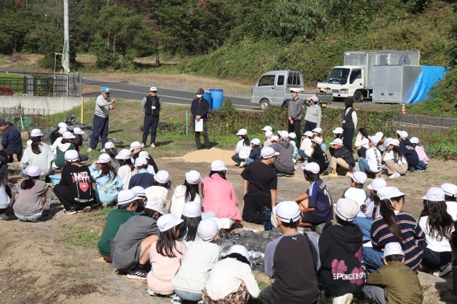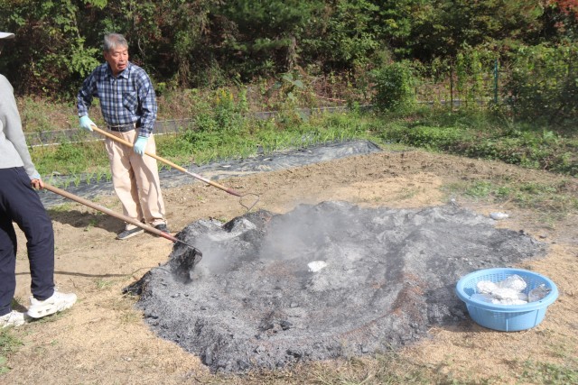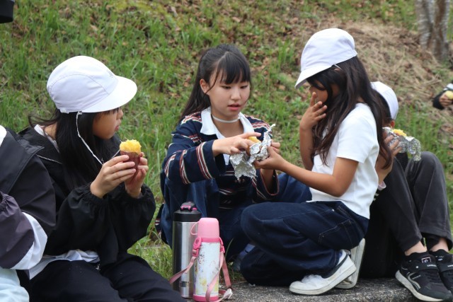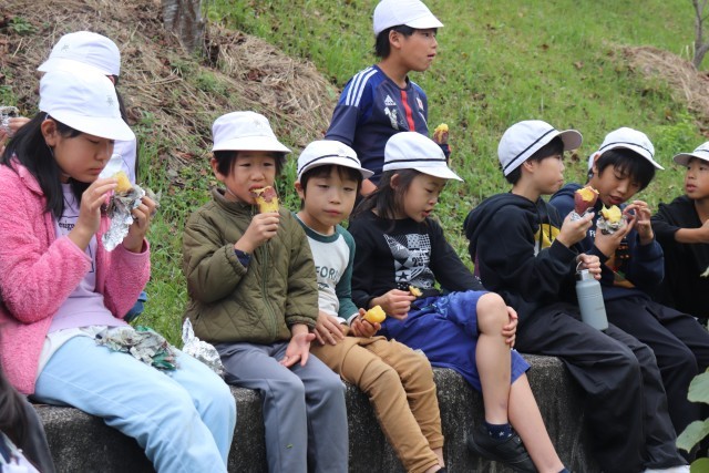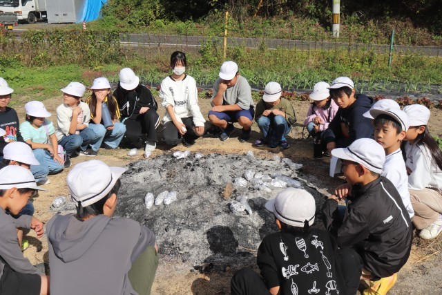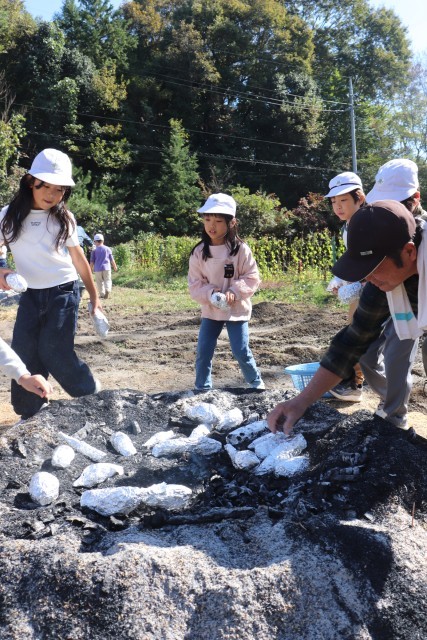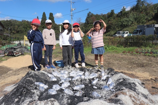 今日は、全校で焼きいも集会をしました。6月に学校の畑に苗を植え、先日、収穫したサツマイモを焼き芋にしました。一昨日から地域の方が籾殻を焚いて炭火の状態で準備してくださっていました。その中に、サツマイモを入れて、じっくり焼き上げます。朝、登校していちばんに各自でサツマイモを洗って新聞紙を巻き、アルミホイルでくるみました。それを縦割り班ごとにかごに集め、1・2年生が運んで炭火の中に並べました。それから2時間ほどたって、炭火の山を掘ってみると・・・熱々の焼き芋が顔を出しました。縦割り班で集合し、6年生を中心に班ごとにおいしくいただきました。5・6年生の人は、1・2年生のお芋を持ってあげたり、アルミホイルを開いてあげたりとお世話する姿も見られました。準備してくださった地域の方に感謝してお芋をいただきました。また、「子どもたちがたくさん食べられるように」お芋を学校に寄付してくださった地域の方にも感謝の気持ちを込めていただきました。