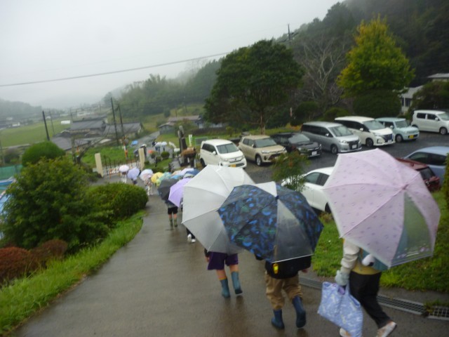 どんよりと厚い雨雲が朝から空を覆い、すっきりしない一日となりました。下校の際に全校が揃ったのを待ち、明日、田熊の回り舞台で「子ども歌舞伎」を演じる児童が前に並びました。みんなで舞台の成功を祈願し拍手を送りました。明日は、天気も回復するようです。これまでの練習の成果が発揮できますように・・・。