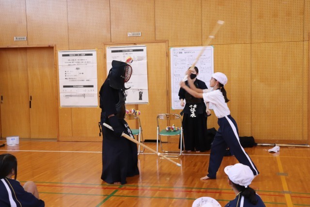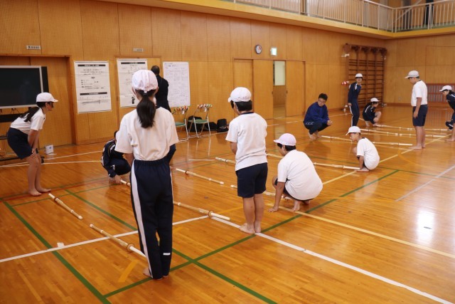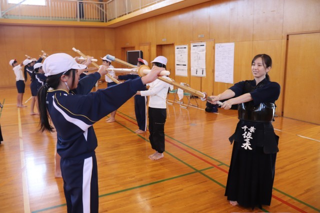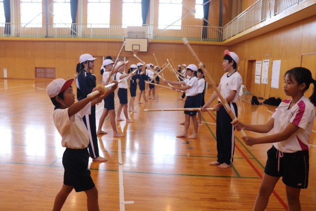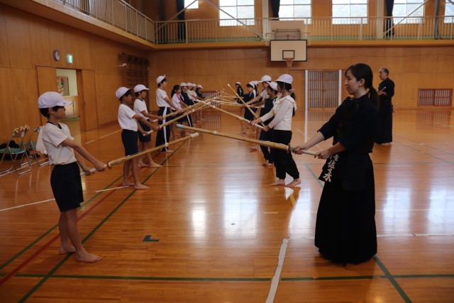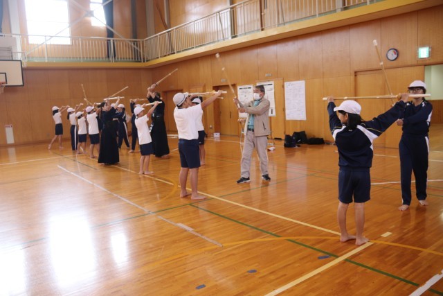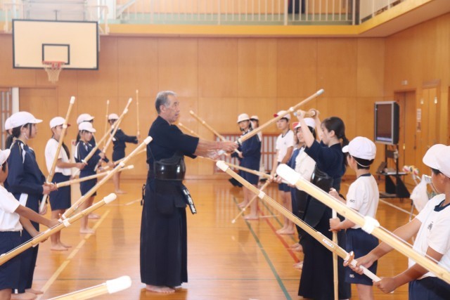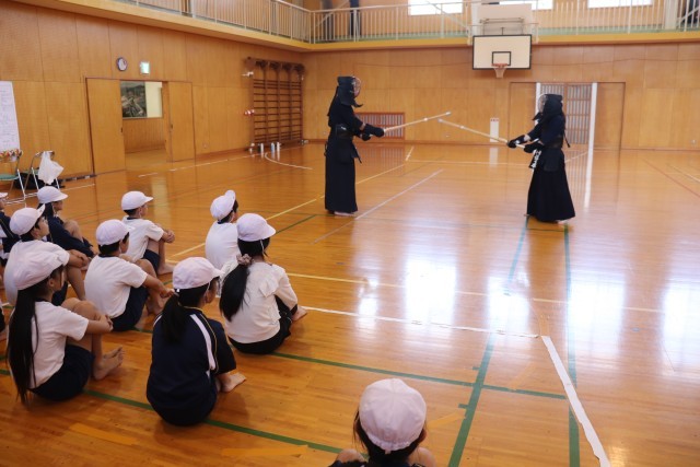 今日は、津山市剣道連盟から講師の先生をお招きして、5・6年生は剣道を体験しました。まずは、剣道では「公明正大」を心がけることや、正座の際は「左座右起」などの約束事を学んだあと、実際に竹刀を持ち面打ちと小手打ちの練習をしていきました。子どもたちは、先生の話を真剣に聞き、相手を変えながら練習していきました。事務の先生も剣道の経験者です。今日は、職員室を離れて剣道の指導に当たりました。最後に、実際に児童の前で模範打ちを見せていただき、子どもたちからは「すごい、かっこいい!」と歓声が上がりました。音楽に合わせて練習したり、頭に紙風船を付けて割ったりと楽しい試行も取り入れて下さり、子どもたちはしっかり剣道を体験することができました。