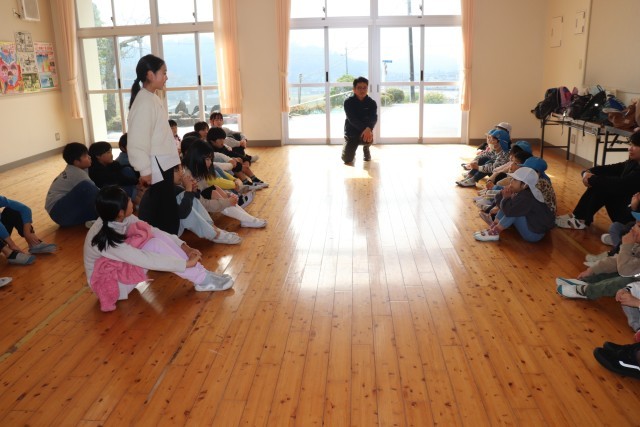 広野保育園の年長組の園児が、広野小学校へやってきました。1学期の読み聞かせ交流に続いて2回目の来校です。前半の学校探検では、いろいろな教室を案内して周りました。それぞれの教室にはキーワードが隠されていて、それらの言葉を並び変えると「いちねんせいがんばれ!」と応援エールになっていました。後半は、体育館で5年生が考えた遊びをしていきました。最後に今日の感想を言い合い、玄関でさよならをして交流会を終えました。