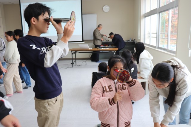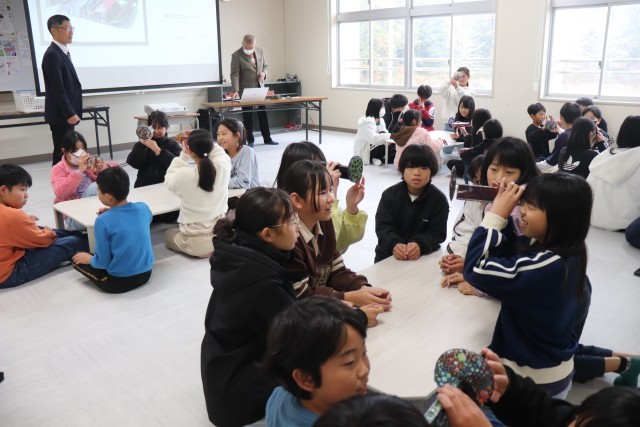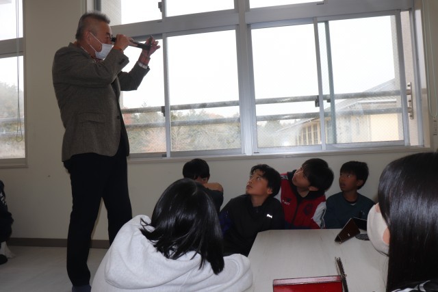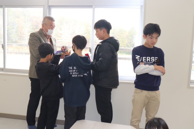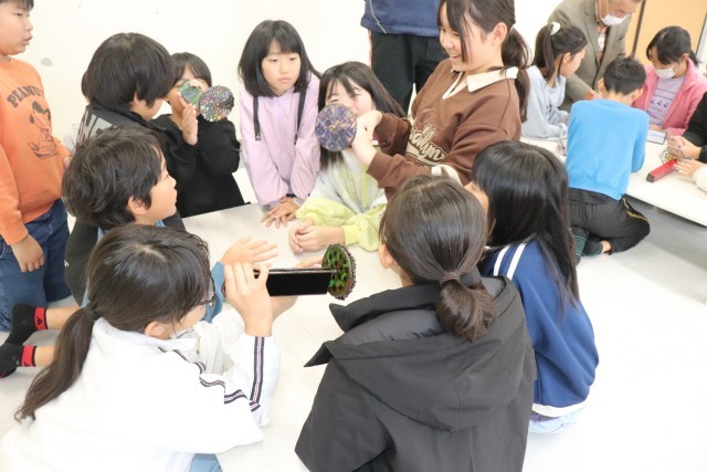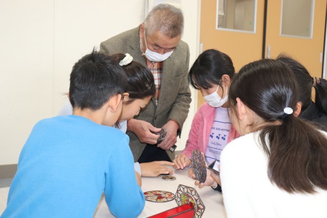 昨年、県北を会場に行われた「森の芸術祭」で反響の大きかった、津山市の江見写真館の江見正暢さんをお招きして特別授業がありました。40年前にステンドグラスを作り始めたのをきっかけに、たくさんの万華鏡を作成されています。今日は、その貴重な万華鏡を実際に手に取り、魅惑的な光の世界を体験しました。授業の後半、5・6年たちは、レンズを変えながら、自分たちでお気に入りの万華鏡を作成しました。「明るい優しい光です」「変化が楽しい」など、江見さんの評価に嬉しそうに耳を傾けていました。子どもたちは、自分たちでも作ってみたい、想像以上にきれいだったと、感想を述べて特別授業を終えました。