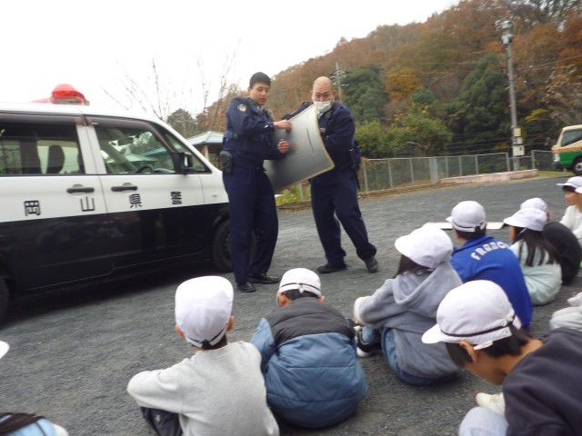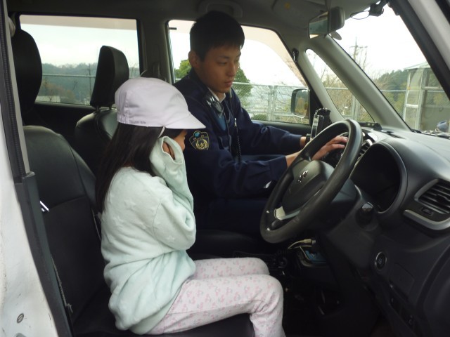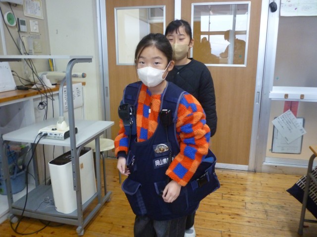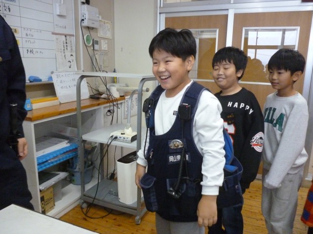 河辺交番の2名の方に来ていただいて、3年生の社会科の授業を行いました。まず、警察の方のお仕事について学んだあと、実際に防弾チョッキを着させていただきました。着てみると、とても重くて子どもたちはびっくりしていました。また、パトカーの中はどの様になっているのかも見せていただきました。全員が体験することで、ますます警察の方のお仕事に興味がわいたようでした。
