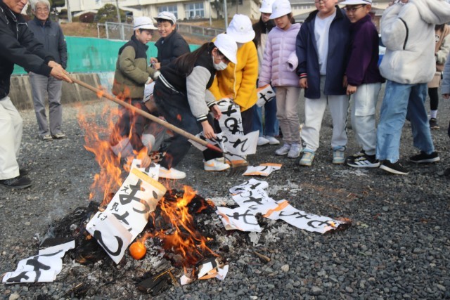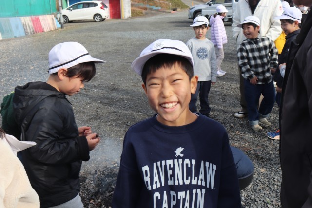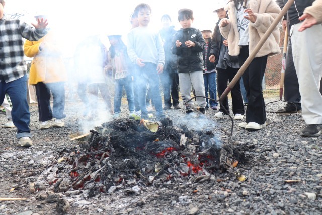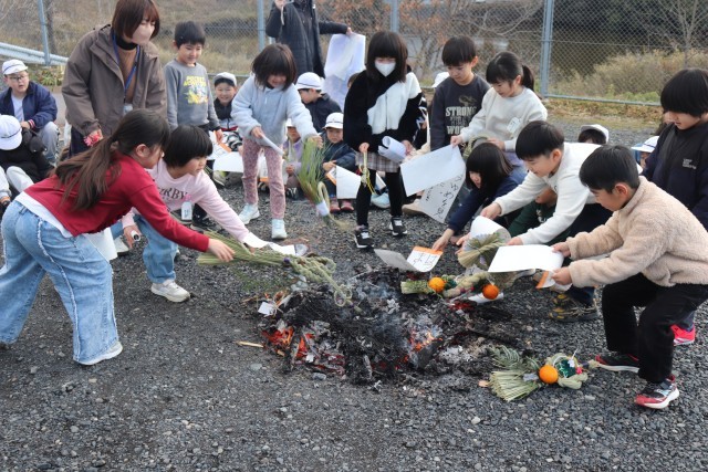 正月に各家庭に来てくださっていた年神様を火と炎で空にお返しし、無病息災・五穀豊穣・家内安全などをお祈りする、とんど焼きを行いました。地域の方からとんど焼きのいわれなどの説明を聞いた後、各学年でお飾りや書初めを焼いていきました。子どもたちは、高く舞い上がる書初めを嬉しそうに眺めていました。焼き終わった後の炭をおでこに付けると、頭がよくなったり病気をしないと言われています。今年も、子どもたちが健やかに成長することを祈って、楽しい行事を終えました。