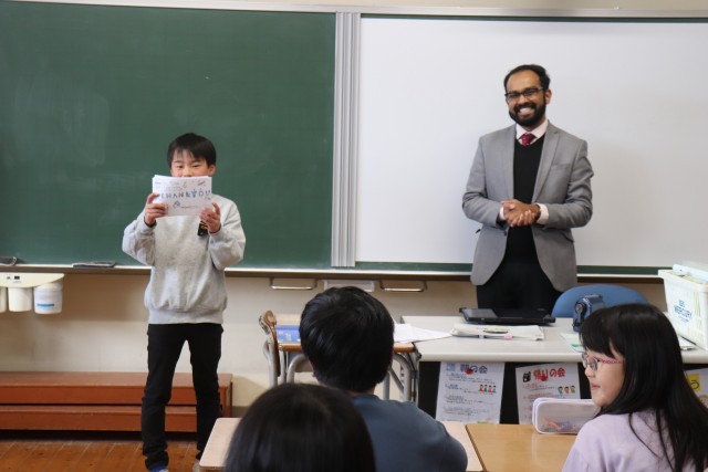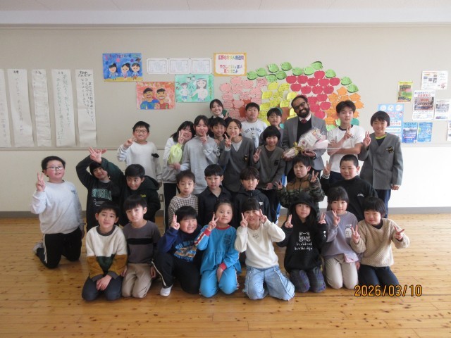 また、その後は3年間ALTとして子どもたちの指導に当たってくださっていたダン先生が来校されました。最後に3年生からのメッセージカードを渡したり、一緒に写真を撮ったりしながら別れを惜しみました。