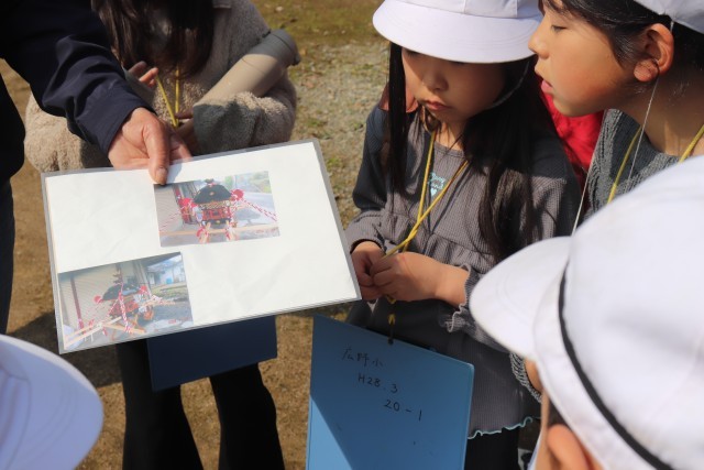 3年生になると、社会の授業で広野地区について学びます。その準備として、2年生は今日「田熊の回り舞台」に見学に行きました。地域の方を講師に、歴史や今も続く祭りについてなど、様々なことを教わりました。神社では、厳かな気持ちになり自然と頭を下げてお祈りする姿も見られました。お忙しい中お話をしてくださった地域の方、本当にありがとうございました。