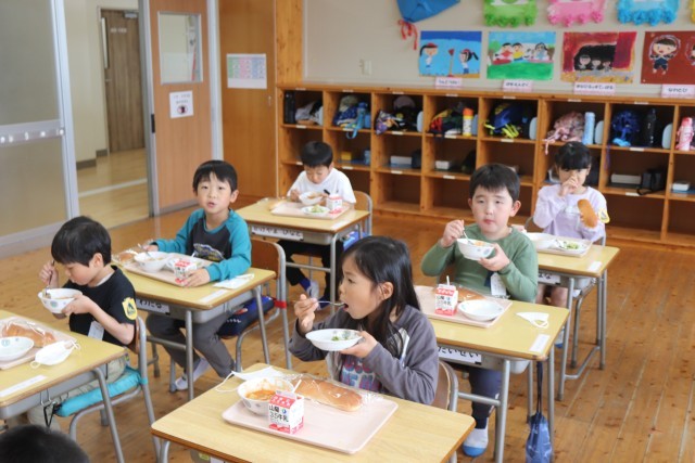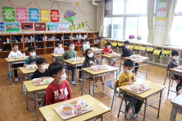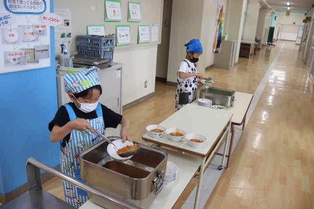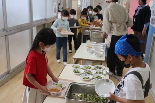 今日から給食が始まりました。1年生の子どもたちは、先生の話をよく聞き、自分たちでサラダやスープを分けたり、食器に乗せたりすることができていました。