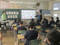 2年生が草加部学校食育センターの先生に、よい姿勢で食器をもち、正しい箸の持ち方で...
