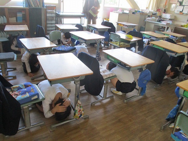 子どもたちは訓練放送を聞くと、すぐに先生の指示を聞き机の下に入り、体を守る姿勢をとりました。