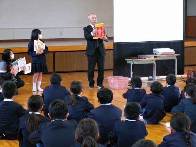 はじめに校長先生から、PTAのみなさんと地域の方から寄贈された図書の本の紹介がありました。