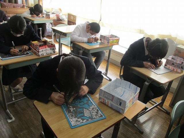 5年生は初めての切り絵学習ですが、カッターナイフの使い方にも慣れ、