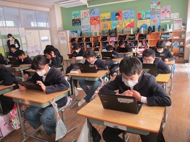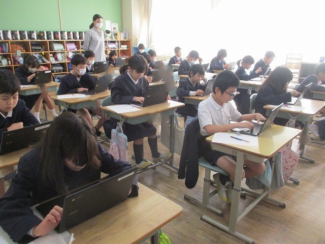 4~6年生は、タブレットを使って行いました。1年生は、初めての学力確認テストです。