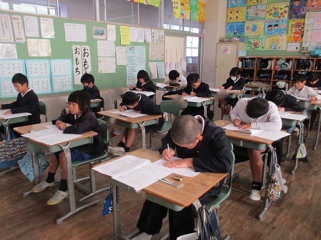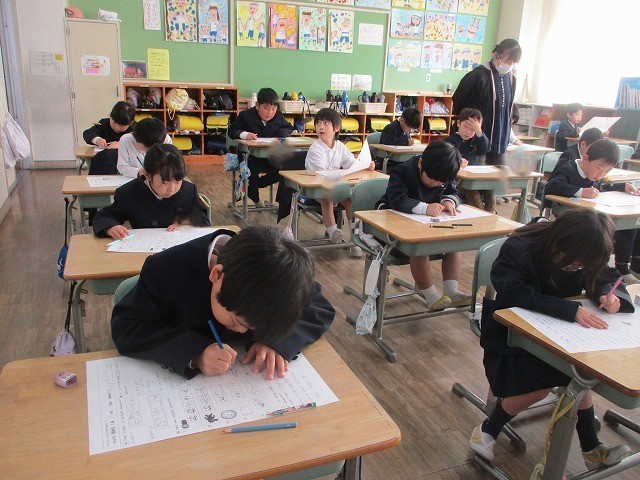 国語と算数を行いました。記述問題もあり、いつもしているテストとは雰囲気が違います。