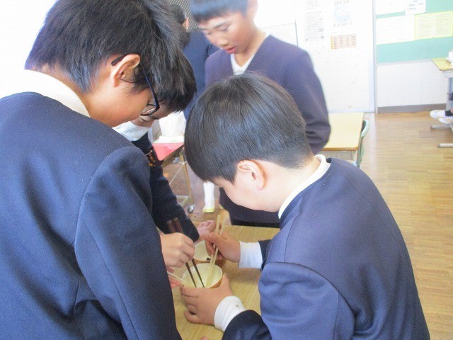 早く食べた6年生から、箸でものをつかむゲームをしました。