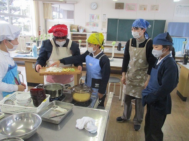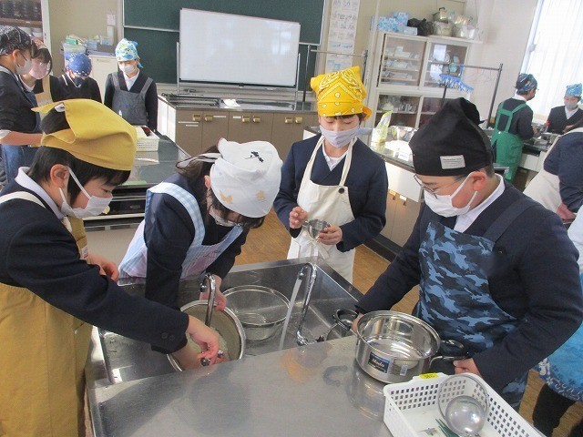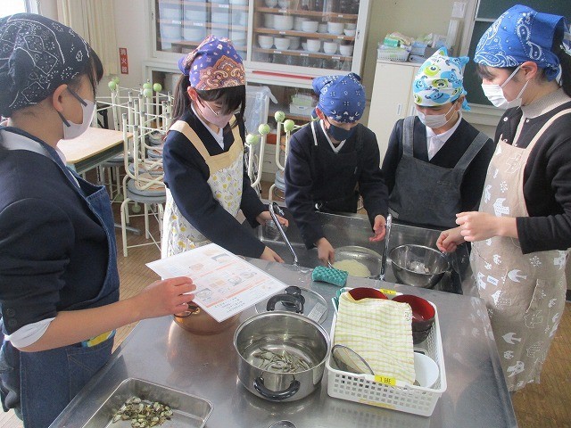 家庭科の実習時間には、だしをとる煮干しの準備をしたり野菜を手際よく切ったりしました。