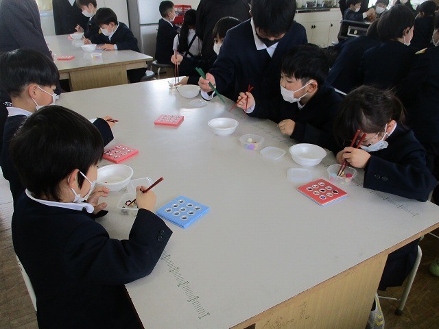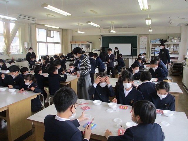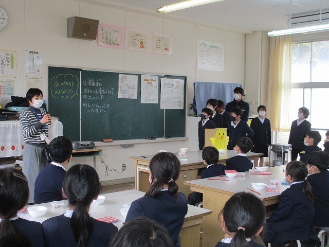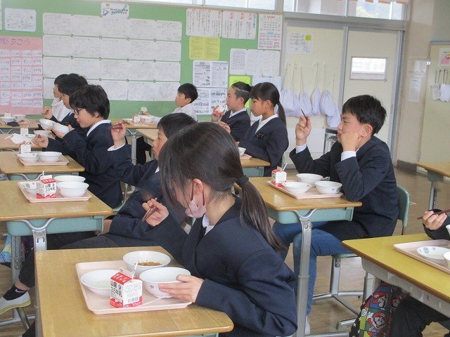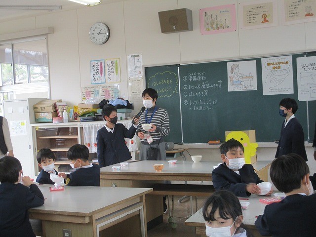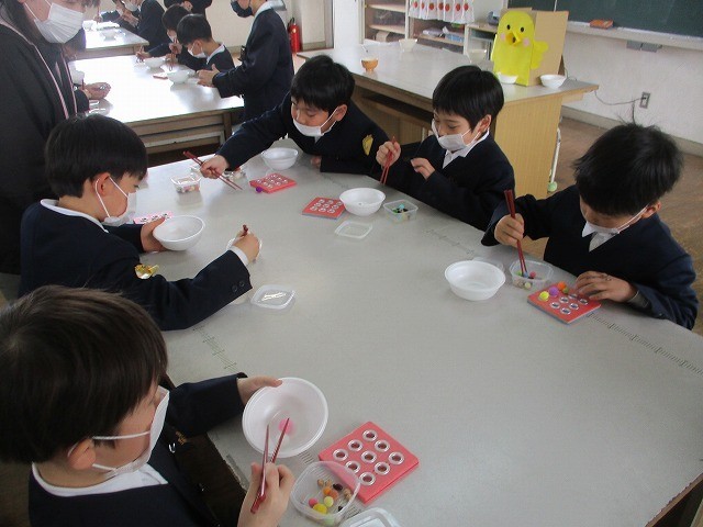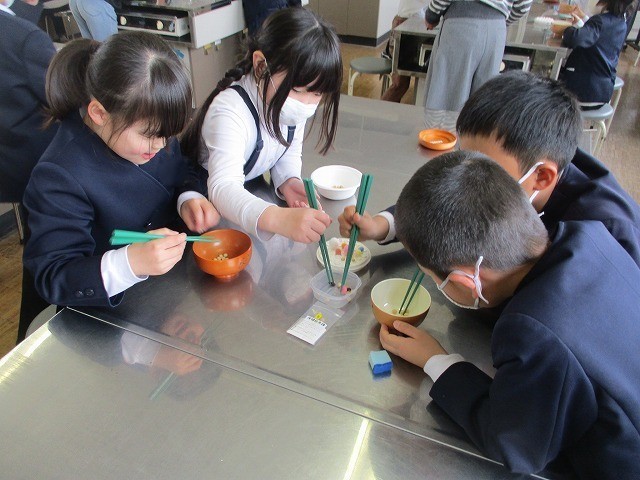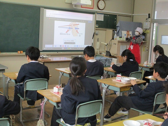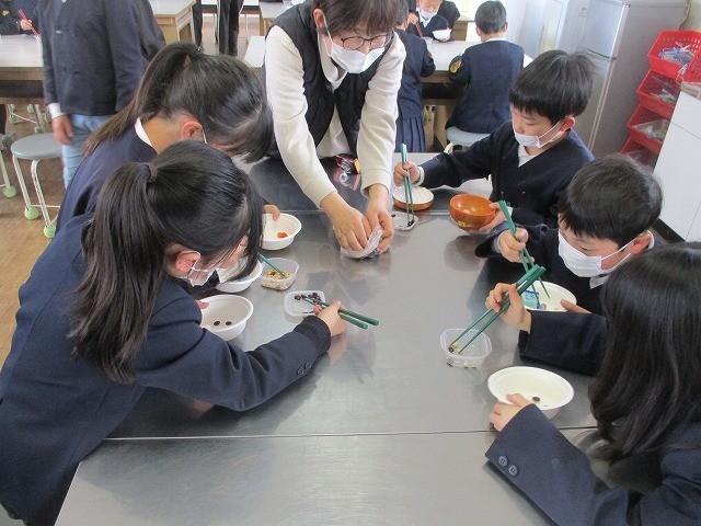 箸の持ち方学習 公開日 2026/02/25 更新日 2026/02/25 お知らせ 草加部学校食育センターの先生に正しい箸の持ち方について教えていただきました。給食時間に5年生が箸の持ち方教室をしました。基本的な持ち方や動かし方を教えていただきました。実際に給食を食べながら意識して箸を持っていました。昼休みには豆運び集会をしました。正しく箸を持って、豆やいろいろなものを運びました。楽しみながら箸の持ち方を練習することができました。 +7