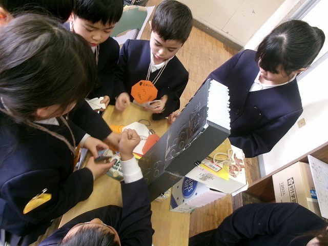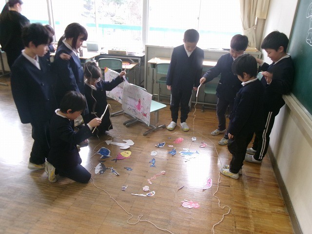 2年生が作ったおもちゃの遊び方の説明を聞いて、1年生は夢中で遊びました。