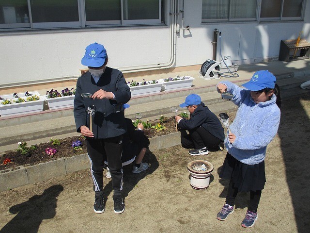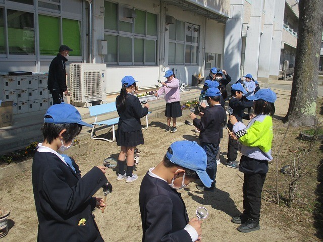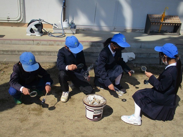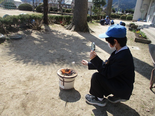 学習の様子 公開日 2026/03/11 更新日 2026/03/11 お知らせ 3年生が理科の学習で、虫めがねを使って火をおこす体験をしました。日光を集めると、ものを早く温めることができることを学習しましたが、実際に火をおこすことができるか、興味津々実験しました。子どもたちは黒く塗った新聞紙のかたまりに虫めがねで集めた日光を当てて火をおこすことができました。おこした火は七輪に移し、マシュマロを焼いて食べました。みんなうれしそうでした。 +5