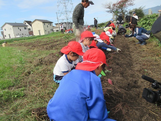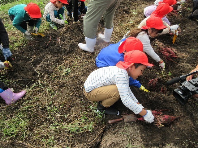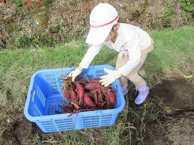 10月7日(火)午前中、1・2年生が「芋ほり」体験を行いました。保護者・地域の方のお世話になり、たくさんの芋を収穫することができました。周りから少しずつ慎重に土を掘り進めて、とても上手に収穫していました。6月に自分たちで植えた芋を収穫する体験ができて、子どもたちはとても喜んでいました。保護者・地域の皆様、御協力ありがとうございました。