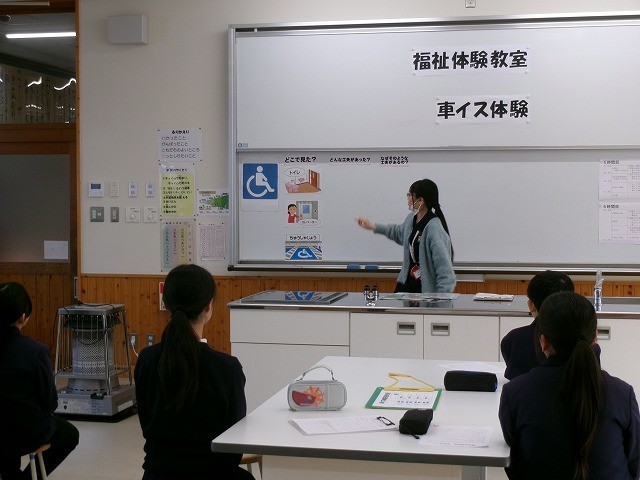 福祉体験教室を実施しました 公開日 2026/01/21 更新日 2026/01/21 学校紹介 1月19日、講師をお迎えして、福祉体験教室を5年生で開催しました。車イスを使って校内を移動する体験も含まれていて、子どもたちは実際に使ってみることで新しい気付きもあったようです。お話を聞いて考えたことや、体験して気付いたことなど、日々の生活の中で生かしてほしいと思います。