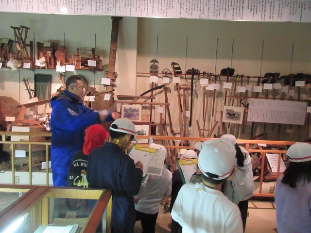 2月3日、3年生が勝北歴史民俗資料館に校外学習に出かけました。古い農具や身の回りでかつて使われていた道具などの説明を聞きながら、昔の生活について学習しました。校外での学習でしたが、昔の生活や農業などいろいろなことを学んだようでした。