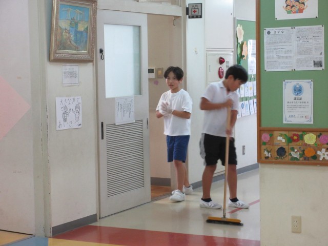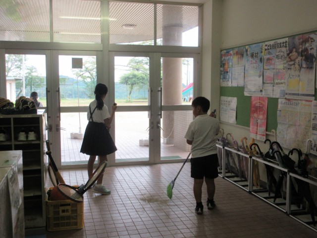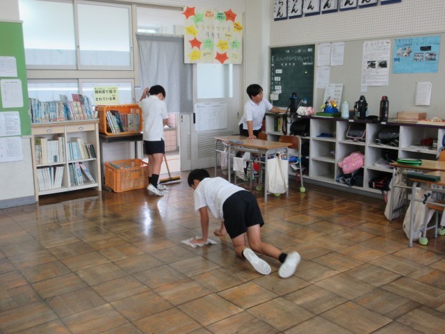 その後の掃除の時間を取材しました。写真は、低学年、中学年が多いのですが、高学年は、トイレや特別教室などを分担してくれています。取りかかりも早く、遊んでいる人は一人もいません。一人分の分担がたくさんあるので、一人ひとりの働きが大切です。みんなで力を合わせて「きれい」を保っています。