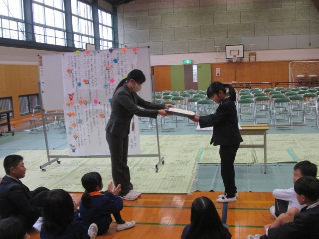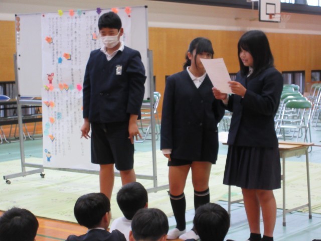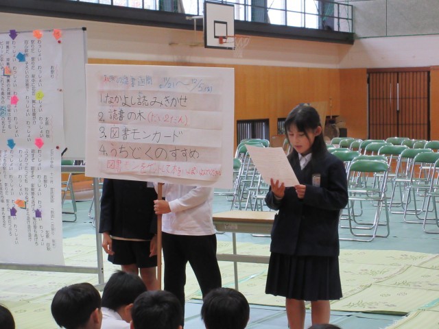 児童朝礼では、図書委員会や保健給食委員会からお知らせがありました。また、図画の表彰もありました。