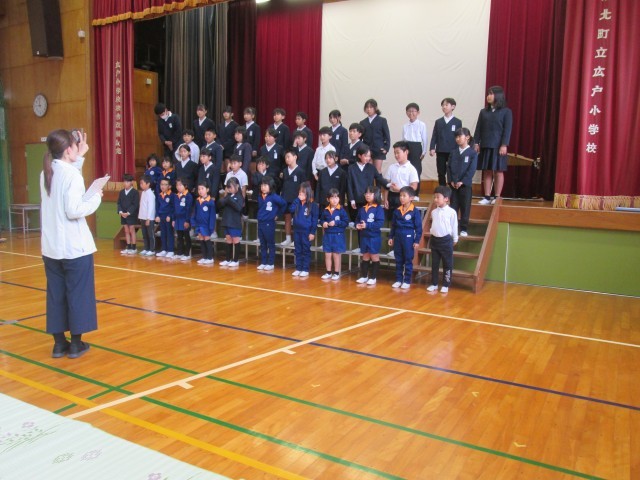 今朝は、児童朝礼からそのまま学習発表会の全校練習をしました。