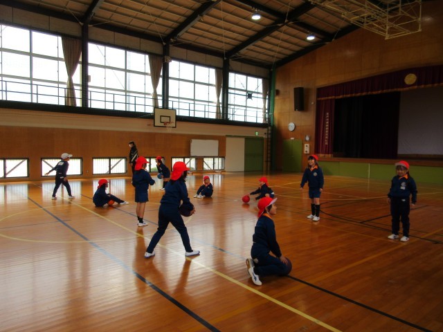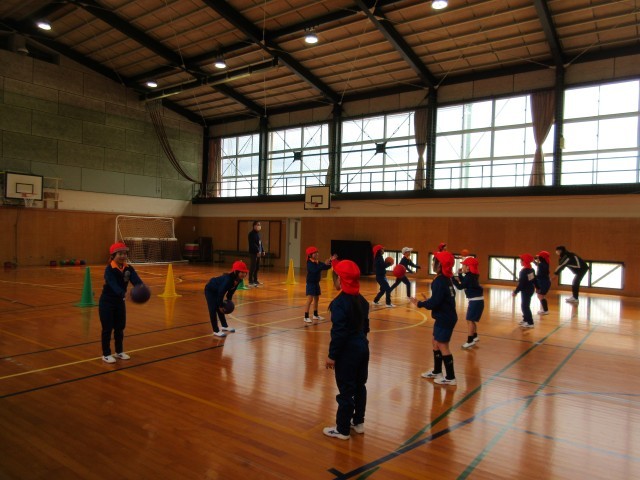 体育館へ行くと、1・2年生がボール運動をしていました。ペアになって、投げたりとったり。練習するうちにどんどん上手になっていました。