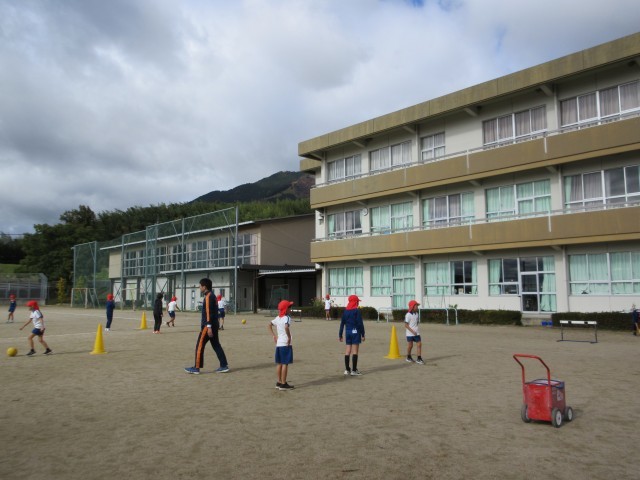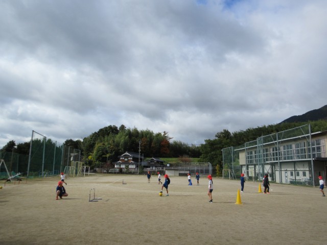 2人組になって、パスの練習をしたり、3人組でハードルをゴールに見立ててシュート練習をしたりしていました。
