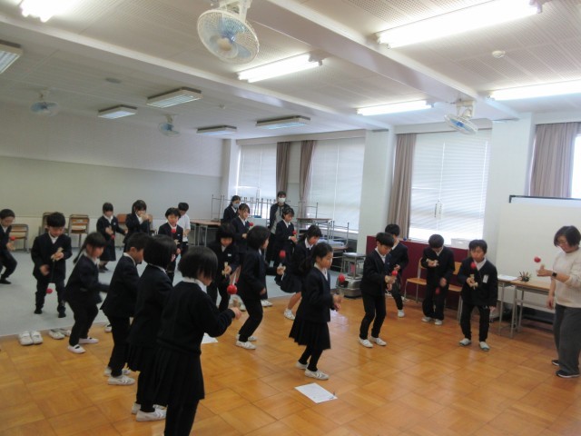 昼休憩から5時間目は、地域の方を講師にお迎えしてのけん玉教室でした。