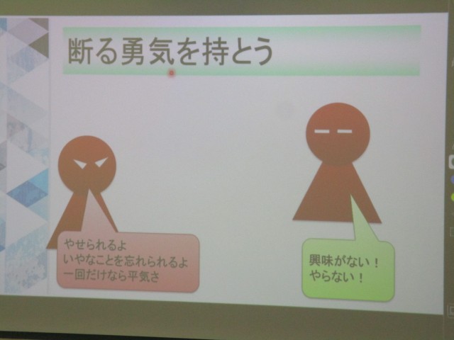 お話を聞くだけではなく、違法薬物を使うように誘われたときの断り方をワークシートに書いて発表するなどの活動もしました。