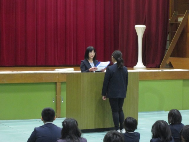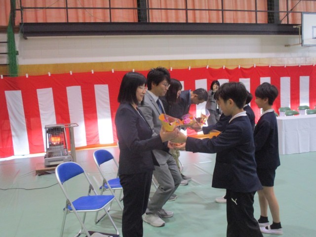 退任式では、お別れする先生から、最後のお話がありました。その後、代表による花束贈呈、最後に校歌をみんなで歌って、お見送りをしました。みんなの素敵な、優しい心が分かる、心のこもった式でした。広戸小をお別れする先生、どうかこれからもお元気で御活躍ください。また会える日を楽しみにしています。