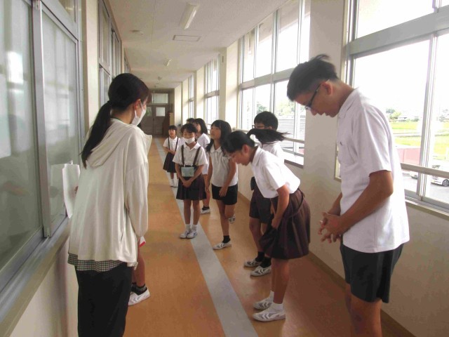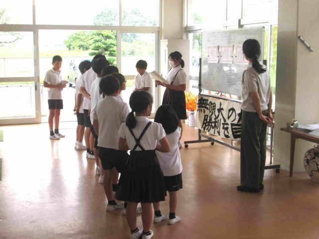 今日からは座って学習する時間が長くなりますが、落ち着いて取り組める児童が多く感心しました。勝加茂小では縦割り班掃除に取り組んでいますが、チーム力や高学年のリーダーシップが運動会でさらに良くなり、今日の掃除もがんばれていました。みんなで分担してはいたり拭いたり、余った時間に草取りをしたりもできていました。6年生の班長が司会する反省では、がんばっていた児童の紹介もあります。これからも高学年が良いお手本を見せる伝統をつないでいってほしいです。