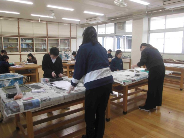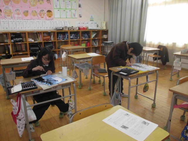 早いもので、2学期終業式まであと6日になりました。教室では版画に取り組んでいる学年が多く、今日は2年生が紙版画の印刷、3年生がゴム版画の彫りをがんばっていました。版画の面白いところは、出来上がりを考えながら作業を行い、実際に印刷して仕上がったときに感動が味わえるところです。みんな思い通りの作品が出来上がるか、楽しみですね。