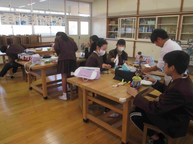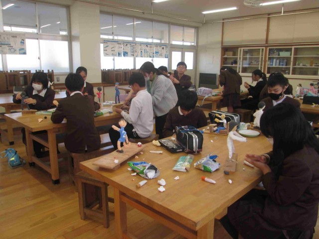 6年生の図工では、紙粘土を使って「将来の夢」の制作に取り組んでいました。教材会社のセットを使うことがい多いのですが、勝加茂小では芯材を針金で作り、土台は廃材の木を使っていました。今日は、針金の芯材に、絵の具で色付けした紙粘土で肉付けしていく作業を行っていました。みんな、紙粘土が乾かない今日のうちに一気に仕上げようと集中して取り組んでいました。作品を見て回っていると、「さて、僕は何になりたいでしょう。」とクイズを出してくれたり、「将来、○○になりたいんだね。」と尋ねると嬉しそうに夢を教えてくれたりしました。とてもいい表情で夢を形にしている姿がほほえましかったです。