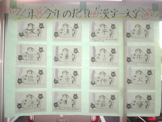 今日は中学年の「今年の抱負」の漢字紹介です。だんだん客観的にいろいろなことが見え始める中学年。自分のあり方、友達との関係、中には世界に思いをはせたものもありました。全学年通じて「もっと伸びたい」「みんなで楽しく過ごしたい」という思いが伝わる取組でした。みんなの張り切っている気持ちを引き出してくれた運営委員会の企画に感謝!です。
