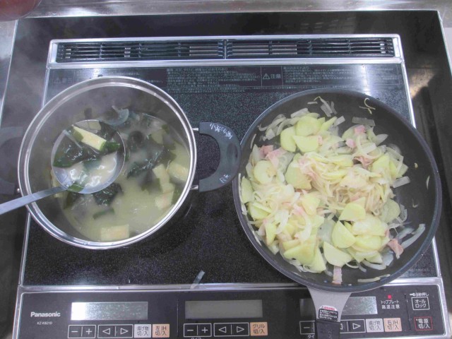 6年生が小学校最後の調理実習に挑戦し、ジャーマンポテトとお味噌汁を作りました。「効率的」が目標の一つだったようですが、みんなが協力し合ってとても上手に作業できていました。お味噌汁は、班ごとに話し合って具材を決めたそうです。わかめと玉ねぎと揚げ、豆腐とえのきだけと揚げ、キャベツを入れた組み合わせなどどれもおいしそうでした。ジャーマンポテトもじゃがいもが柔らかくおいしくできたようです。給食がラーメンだったので「まだおなかがいっぱいだけど。」と言いつつ、残さず全部食べた元気な6年生です。