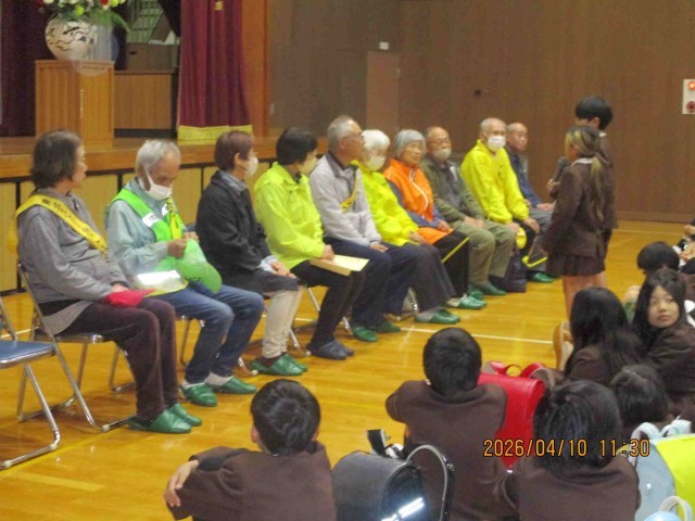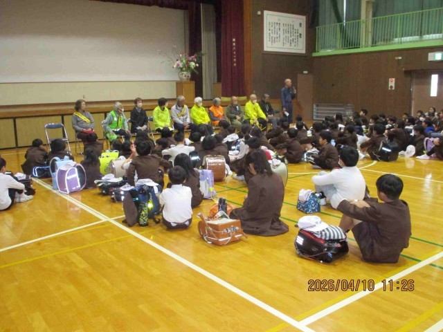 下校前には、各地区の見守りボランティアの代表の皆さんが来校してくださり、体育館で顔合わせ会を行いました。6年生の代表から、見守りへのお礼としっかりあいさつしたいという気持ちを伝えることができました。そのあと、たくさんの見守りボランティアの皆様が一緒に歩いて帰ってくださいました。職員も一緒に歩き、見守り110番場所の確認をしたり、お願いとお礼のお手紙を届けたりしています。