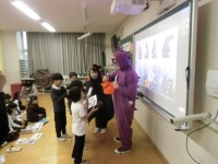 2月14日(火)1校時,1年生はALTの先生と一緒に英語の学習をしました。1・2年生では,年間6時間,ALTの先生と一緒に英語に触れ合う時間を設定しています。