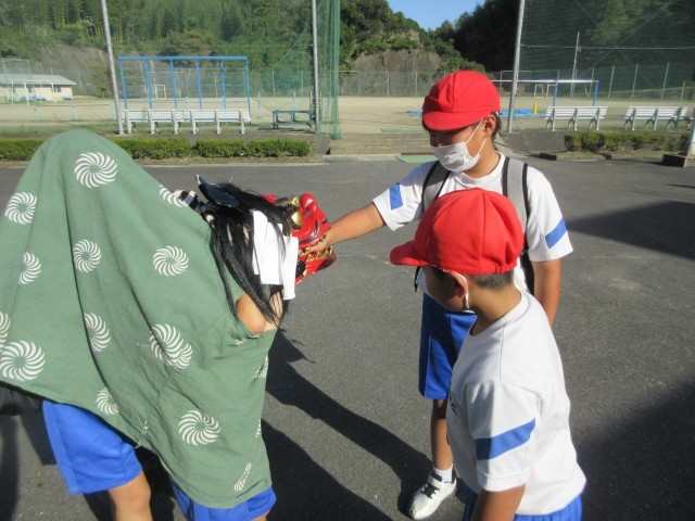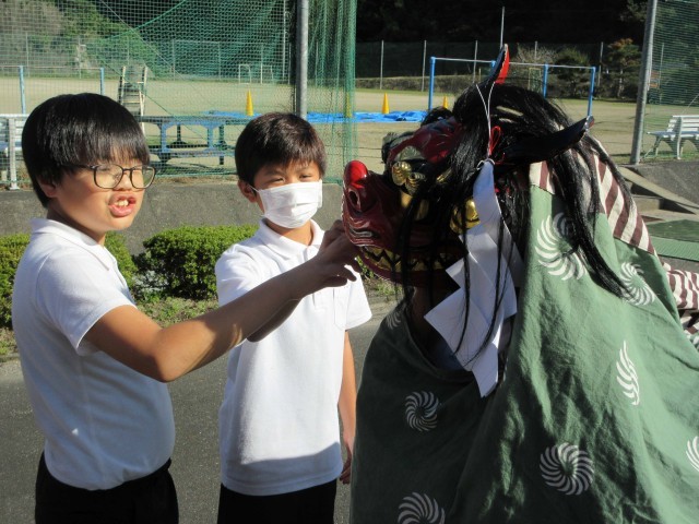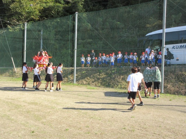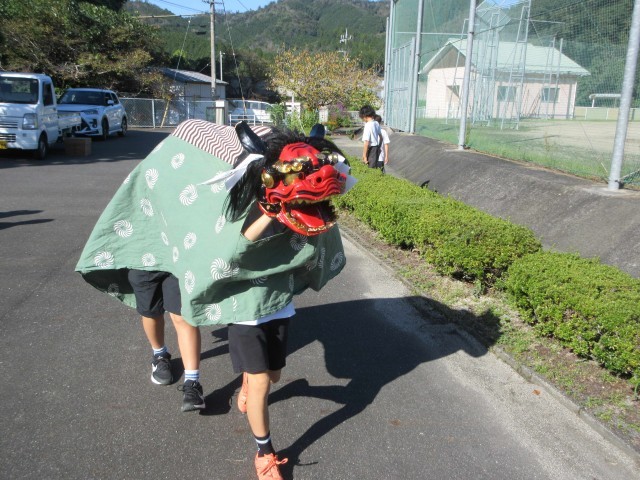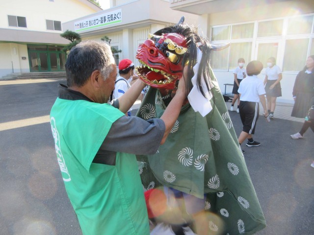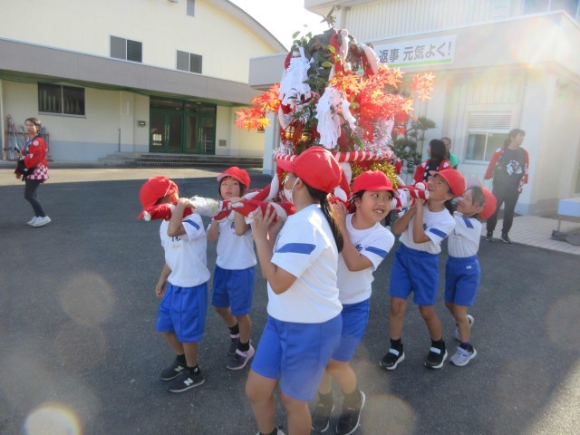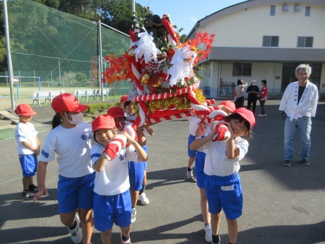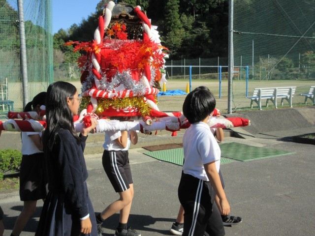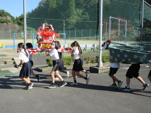 10月17日は、毎年恒例の七森神社の秋祭りです。今年は5時間目が終わった頃、坪井の地域の皆様が女神輿と獅子舞を学校まで持ってきてくださいました。昔から受け継がれている地域の伝統のお祭りを、まずは5・6年生が先に神輿を担いだり、獅子舞に入ってねり歩いたりしました。1~4年生が校外学習からバスで帰ってくると、神輿で迎えに行ってくれ、へとへとだった1~4年生も笑顔になり校舎まで一緒に帰ってきました。子どもたちも職員も楽しんで、「わっしょい わっしょい」とにぎやかに、お祭り気分をみんなで味わいました。