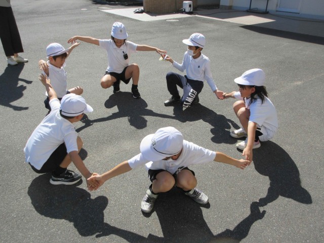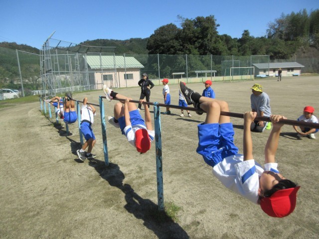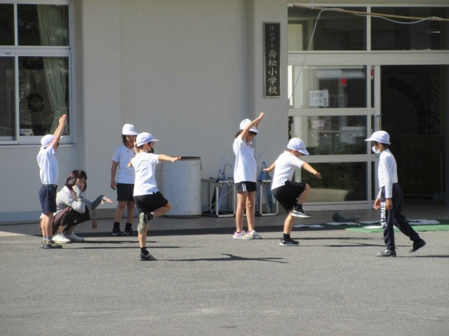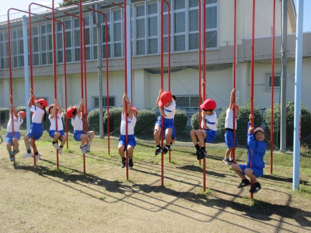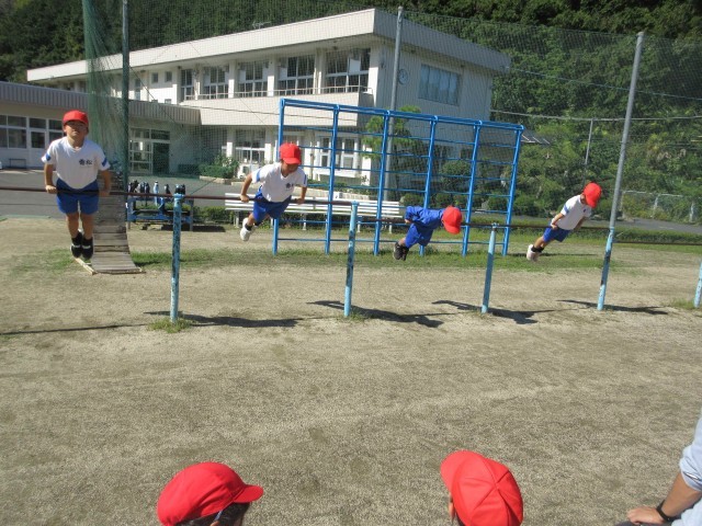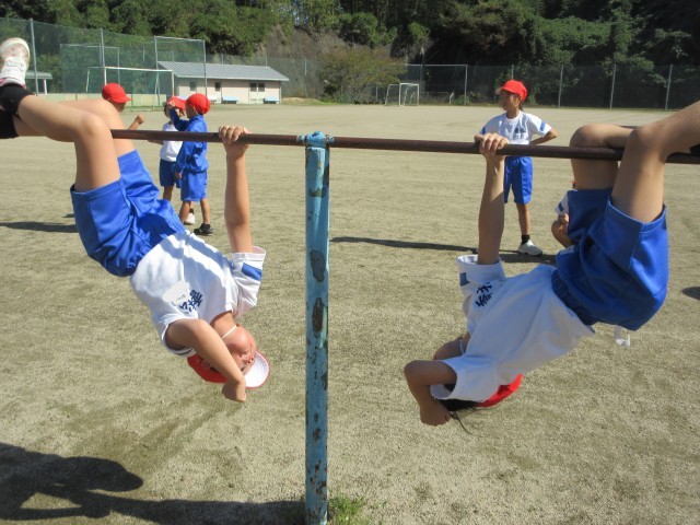 今日の3時間は、太陽がよく照っており快晴でした。3年生は理科で、自分たちの影を使って学習していました。直線や丸くつながったり、1人で出来る形にチャレンジしたりと、体を使って頭で考えて、楽しそうに学習していました。1・2年生は体育で、準備運動として登り棒に長くつかまったり、ツバメや洗濯物、ナマケモノ、豚の丸焼きなど鉄棒の技を繰り返し行ったりしていました。今日の技は、「前回り」でコツを教えてもらった後、自分に合った高さで練習をしていました。どんどん上達している1・2年生です。