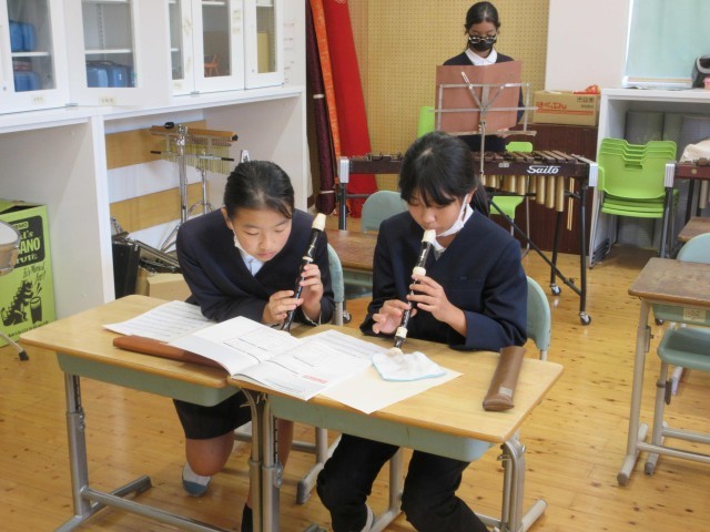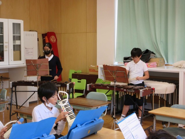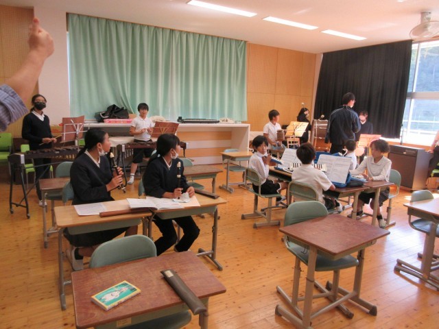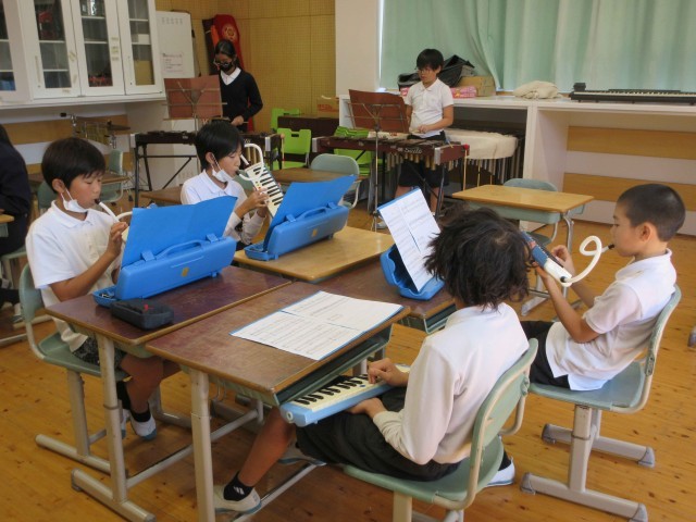 5・6年生は音楽の時間、学習発表会に向けて合奏の練習をしていました。曲は「アメリカンシンフォニー」で、大太鼓、タンバリン、ボンゴや木琴、リコーダー、鍵盤ハーモニカに分かれて、楽器別に練習を頑張っていました。途中、途中でみんなと合わせてみると、先週に比べて合わせられるところが増えたきました。少ない人数だからこそ、一人ひとりの役割は大きいです。自分で個人練習を積んで、更にみんなで合わせられるように頑張ろう!!