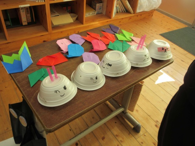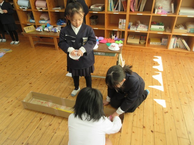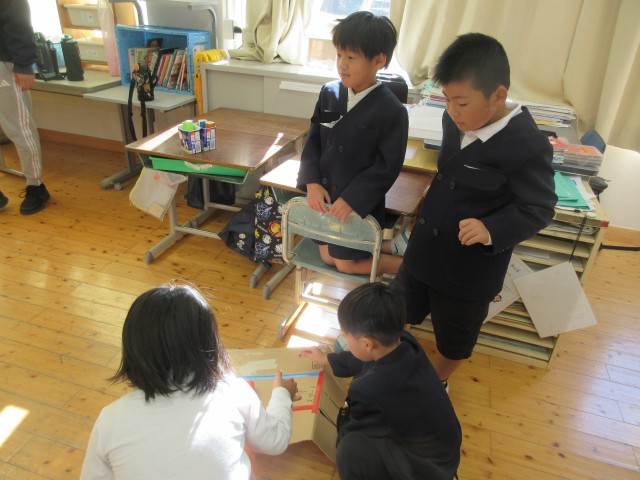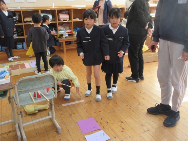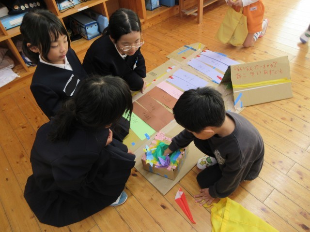 今日は、1・2年生と来年度に入学してくる5名の年長さんとの交流会がありました。少し前から準備していた手作りの遊びコーナーが4つあり、プレゼントなどがそれぞれ用意してありました。年長さんの友だちが来ると、ゲームの遊び方を説明して、実際にやって見せたり、手伝ったりとお兄さん・お姉さんとして活躍していました。みんなに「すごい!」「上手!」など褒めてもらって、年長さん達もうれしそうでした。みんなの感想は「準備は大変だったけれど、年長さんが喜んでくれてうれしかった。」「楽しかった。」「4月が楽しみ。」と教えてくれました。1・2年生がぐんと大きく感じられた交流会でした。