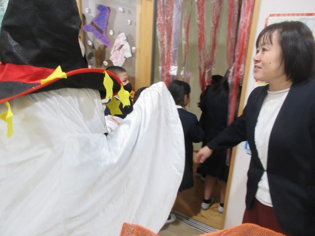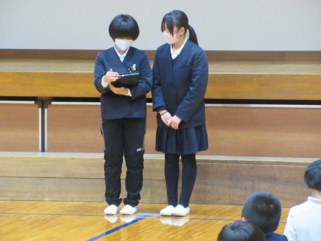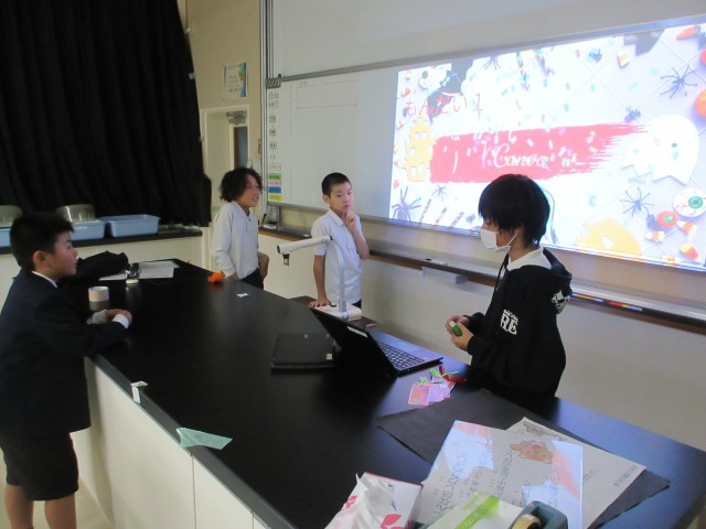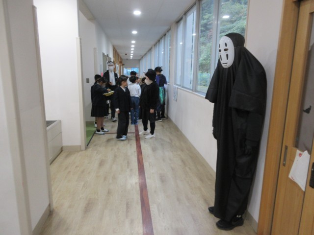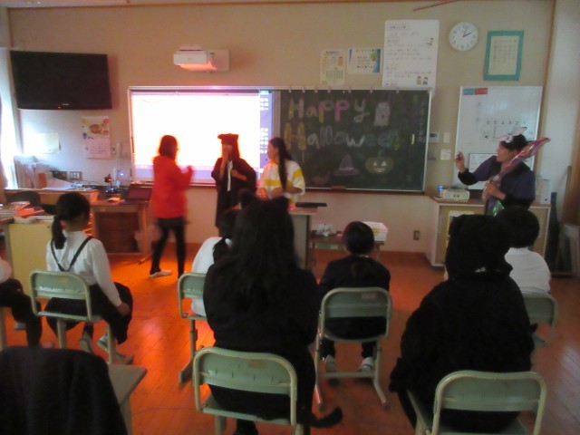 5・6年生がやってみようチャレンジで企画してくれた「ハッピーハロウィン」がありました。はじめに体育館でルール説明などを聞いた後に、5・6年生は用意していた思い思いのハロウィンの仮装をして、4つの部屋に分かれて1~4年生を出迎えていました。そこでは、外国語活動の学習として、英語で自己紹介をした後に、部屋ごとに各学年の問題がスクリーンに映し出され、色や動物、形、数字など英語で答えていました。4部屋をクリアしたら、最後は音楽室が暗いお化け屋敷風になっていて、驚かせていました。楽しいアイデア企画で、全校のみんなが笑顔になれました!ありがとう。*先生達の仮装が少し力が入りすぎていました。