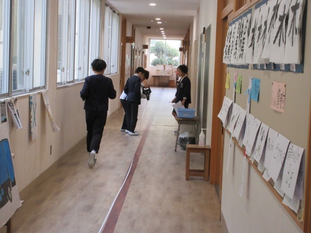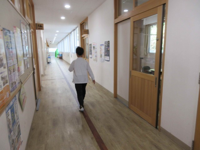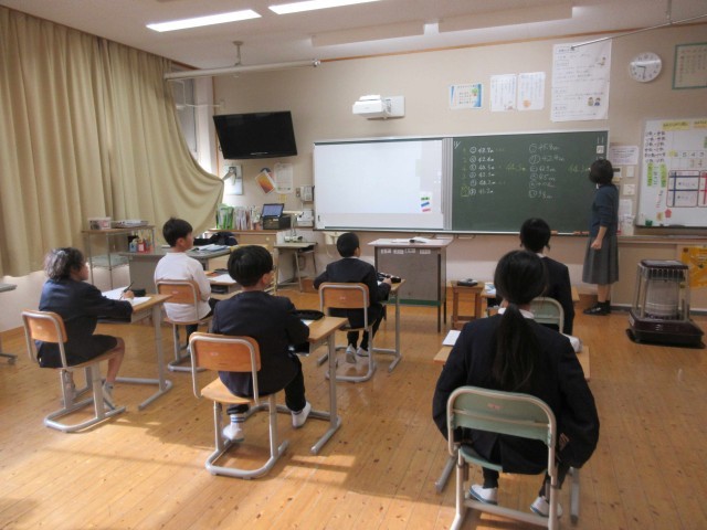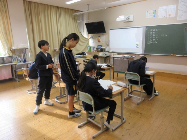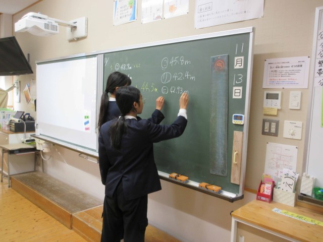 5年生の算数では、平均を使っておよその道のりを求める学習をしていました。実際に10歩歩いた距離から、1歩あたりの平均を出し、算数教室から校長室までの歩数を、1人4~5回歩いて歩数の平均を求め、道のりを計算していました。みんなにている数字が出ていました。最後に、メジャーで実測して数値を比べていました。一番近い人で0.7メートルの誤差でした。平均を活用しての学習を、意欲的に楽しそうに取り組んでいた5年生でした!*職場体験で来ている中学生も一緒に参加をしてくれていました。