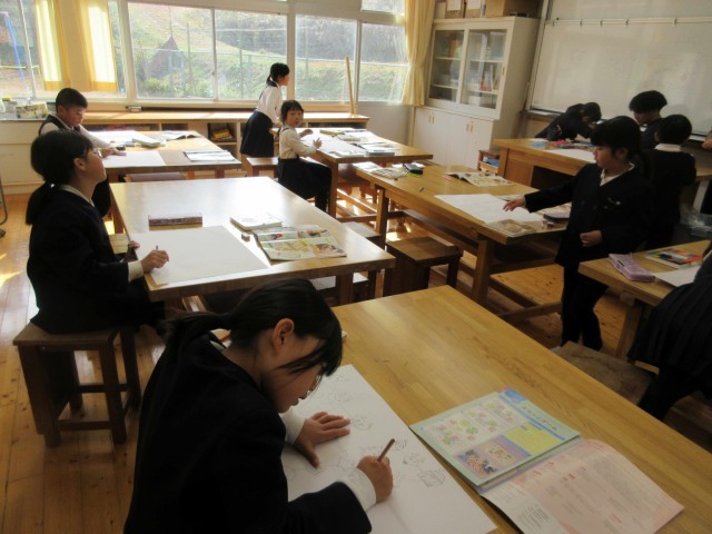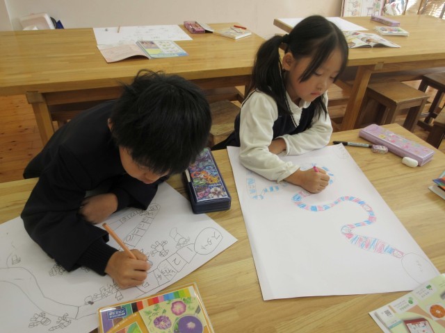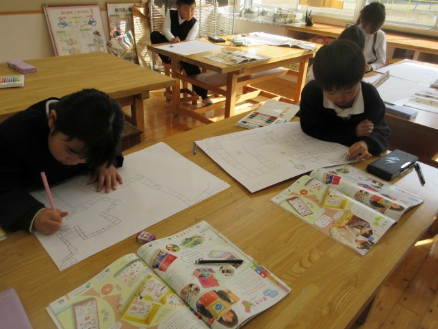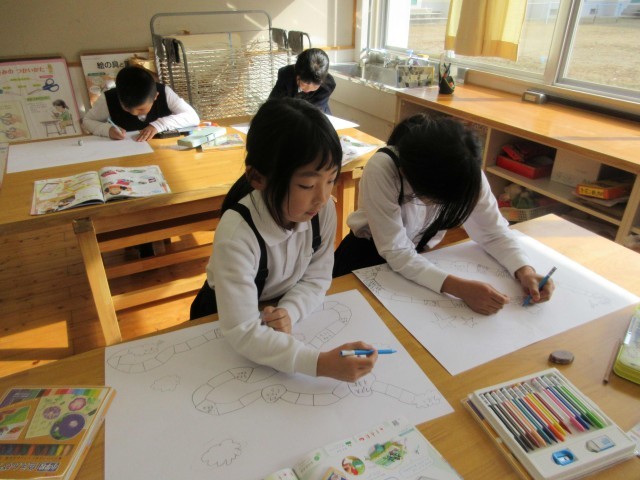 1・2年生は図工の時間に「おはなしすごろく」作りをしました。スタートとゴールを画用紙に描いてから、その間をいろいろな形でつないでいっていました。○マス戻る、進む、振り出しに戻るなど定番のものもあれば、喬松小のキャラクターである「まっちゃん」を6回言うやスクワットをするなど、自分の考えたマスもあったり、へびの形になったすごろくやマスがクリスマスの絵になったりしているものもありました。工夫いっぱいの楽しいすごろくが作れていました。完成後は実際に遊んでみるさいころが用意してありました。楽しみですね!
